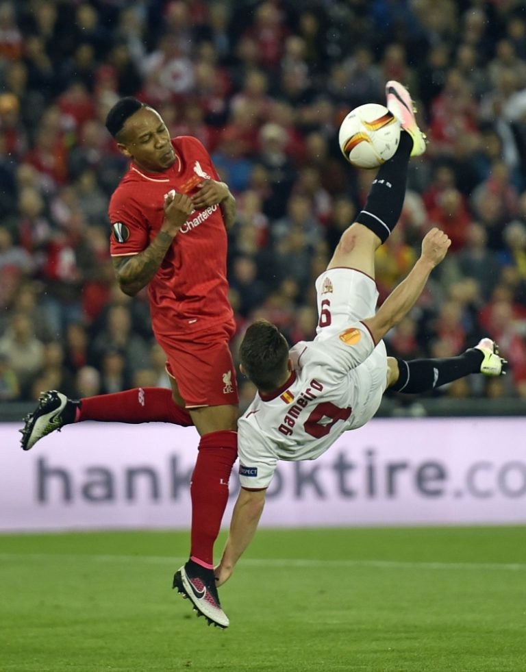 Kevin Gameiro z FC Sevilla odkopáva loptu pred hráčom FC Liverpool počas finálového zápasu Európskej ligy na Štadióne sv. Jakuba v Bazileji. Bazilej, 18. máj 2016. Foto: SITA/AP