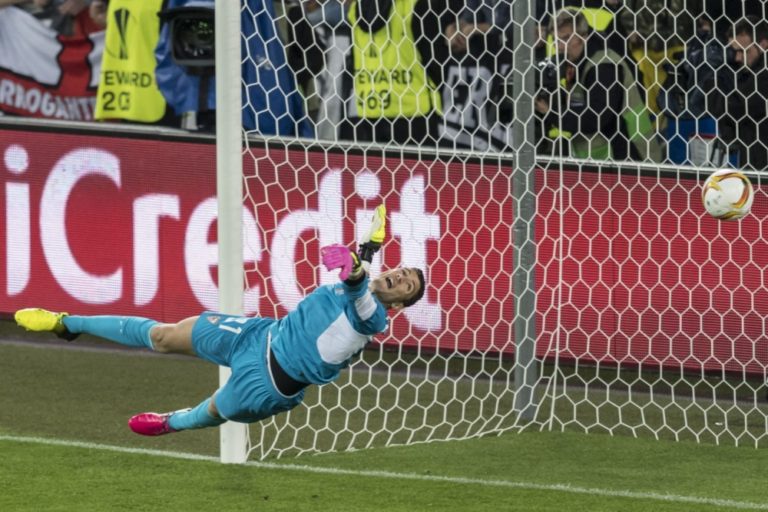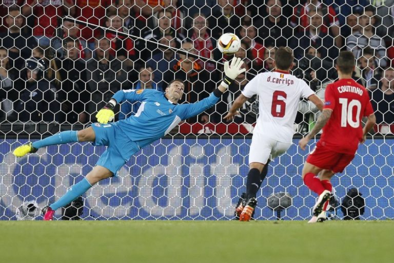 Zákrok brankára FC Sevilla Davida Soriu po strele Philippa Coutinha počas finálového zápasu Európskej ligy na Štadióne sv Jakuba v Bazileji. Bazilej, 18. máj 2016. Foto: Peter Klaunzer/Keystone via AP