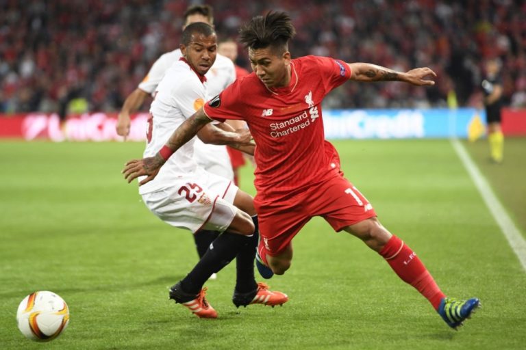 Roberto Firmino z FC Liverpool v súboji s Marianom Ferreirom z FC Sevilla počas finálového zápasu Európskej ligy na Štadióne sv Jakuba v Bazileji. Bazilej, 18. máj 2016. Foto: Georgios Kefalas/Keystone via AP