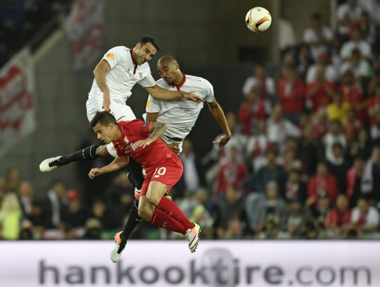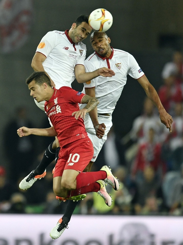 Hráči FC Sevilla Adil Rami a Steven N'Zonzi v hlavičkovom súboji s Philippem Coutinhom z FC Liverpool počas finálového zápasu Európskej ligy na Štadióne sv Jakuba v Bazileji. Bazilej, 18. máj 2016. Foto: SITA/AP