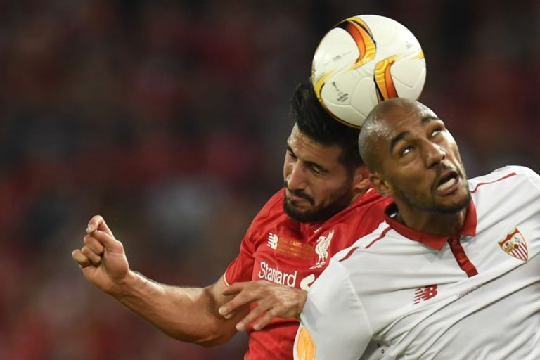 Steven N'Zonzi v hlavičkovom súboji s Emrem Canom z FC Liverpool počas finálového zápasu Európskej ligy na Štadióne sv Jakuba v Bazileji. Bazilej, 18. máj 2016. Foto: Jean-Christophe Bott/Keystone via AP