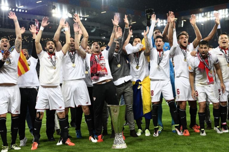 Radosť hráčov FC Sevilla s víťaznou trofejou po finálovom zápase Európskej ligy, v ktorom na Štadióne sv. Jakuba v Bazileji zdolali FC Liverpool 3:1. Bazilej, 18. máj 2016. Foto: SITA/AP