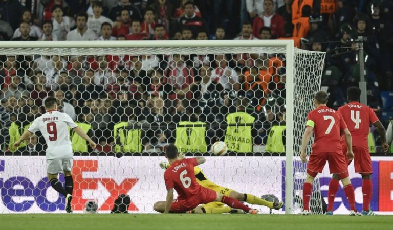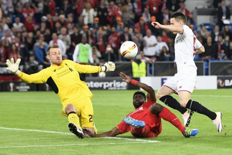 Kevin Gameiro z FC Sevilla prekonáva brankára FC Liverpool počas finálového zápasu Európskej ligy na Štadióne sv Jakuba v Bazileji. Bazilej, 18. máj 2016. Foto: SITA/AP