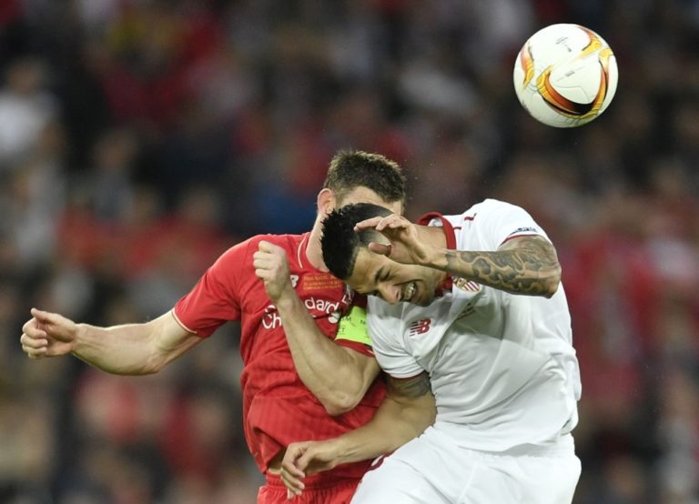 Vitolo z FC Sevilla v hlavičkovom súboji s Jamesom Milnerom z FC Liverpool počas finálového zápasu Európskej ligy na Štadióne sv Jakuba v Bazileji. Bazilej, 18. máj 2016. Foto: SITA/AP