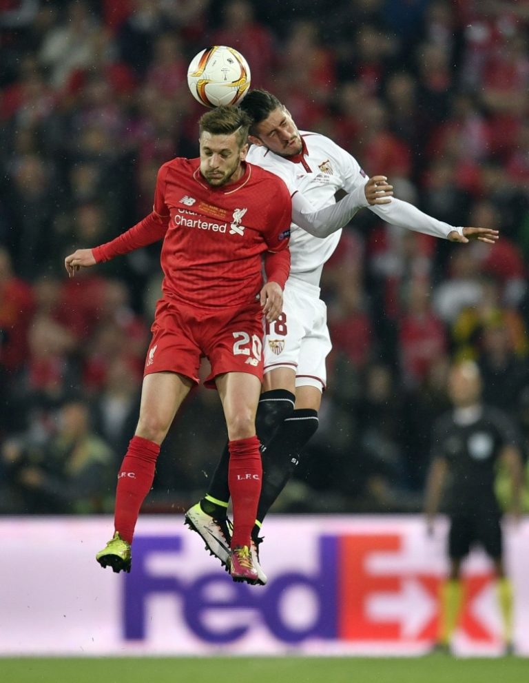 Adam Lallana z FC Liverpool v hlavičkovom súboji so Sergiom Escuderom z FC Sevilla počas finálového zápasu Európskej ligy na Štadióne sv Jakuba v Bazileji. Bazilej, 18. máj 2016. Foto: Jean-Christophe Bott/Keystone via AP
