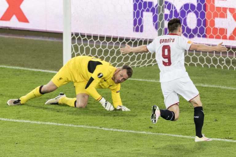 Kevin Gameiro z FC Sevilla prekonáva brankára FC Liverpool Simona Mignoleta počas finálového zápasu Európskej ligy na Štadióne sv Jakuba v Bazileji. Bazilej, 18. máj 2016. Foto: Jean-Christophe Bott/Keystone via AP