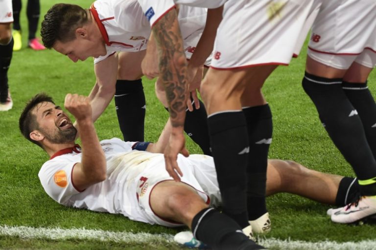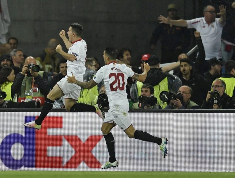 Coke z FC Sevilla sa teší z gólu v sieti FC Liverpool počas finálového zápasu Európskej ligy na Štadióne sv. Jakuba v Bazileji. Bazilej, 18. máj 2016. Foto: Jean-Christophe Bott/Keystone via AP