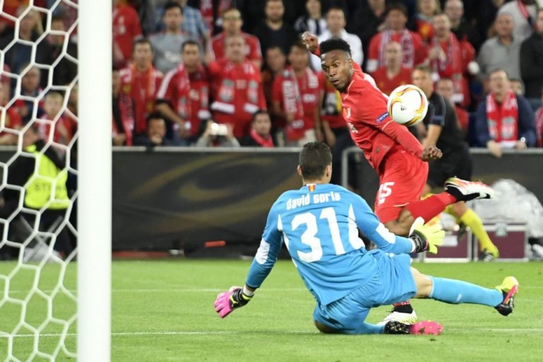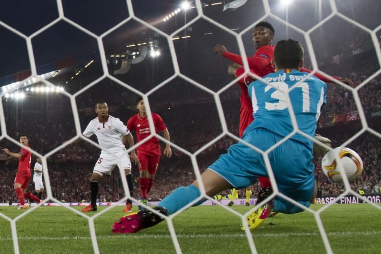Lopta z kopačky Daniela Sturridgea skončila za chrbtom brankára FC Sevilla Davida Soriu počas finálového zápasu Európskej ligy na Štadióne sv Jakuba v Bazileji. Bazilej, 18. máj 2016. Foto: Ennio Leanza/Keystone via AP