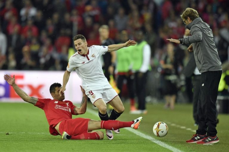 Dejan Lovren z FC Liverpool fauluje Kevina Gameira z FC Sevilla počas finálového zápasu Európskej ligy na Štadióne sv Jakuba v Bazileji. Bazilej, 18. máj 2016. Foto: SITA/AP