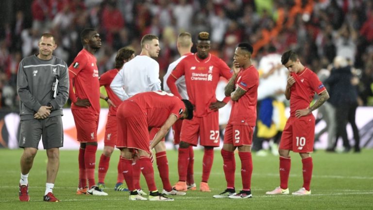 Smutní hráči FC Liverpool po finálovom zápase Európskej ligy, v ktorom na Štadióne sv. Jakuba v Bazileji podľahli FC Sevilla 1:3. Bazilej, 18. máj 2016. Foto: SITA/AP