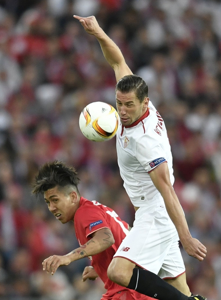 Grzegorz Krychowiak z FC Sevilla v súboji s Robertom Firminom z FC Liverpool počas finálového zápasu Európskej ligy na Štadióne sv. Jakuba v Bazileji. Bazilej, 18. máj 2016. Foto: SITA/AP