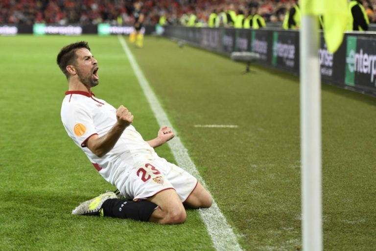 Coke z FC Sevilla sa raduje z gólu v sieti FC Liverpool počas finálového zápasu Európskej ligy na Štadióne sv Jakuba v Bazileji. Bazilej, 18. máj 2016. Foto: Jean-Christophe Bott/Keystone via AP