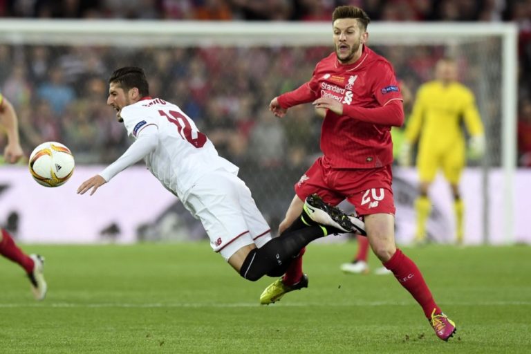Adam Lallana z FC Liverpool v súboji so Sergiom Escuderom z FC Sevilla počas finálového zápasu Európskej ligy na Štadióne sv. Jakuba v Bazileji. Bazilej, 18. máj 2016. Foto: Laurent Gillieron/Keystone via AP
