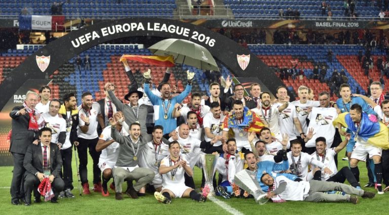 Radosť hráčov FC Sevilla po finálovom zápase Európskej ligy, v ktorom na Štadióne sv. Jakuba v Bazileji zdolali FC Liverpool 3:1. Bazilej, 18. máj 2016. Foto: Jean-Christophe Bott/Keystone via AP