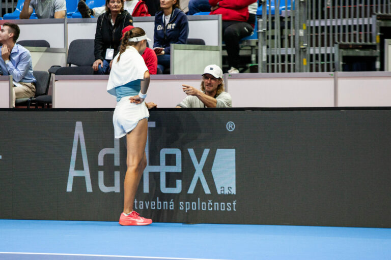 Renáta Jamrichová a jej tréner Ján Matúš počas finálového zápasu ženskej dvojhry turnaja J&T Banka Slovak Open 2024 v Peugeot aréne v Bratislave. Bratislava, 13. október 2024. Foto: SITA/Tomáš Bokor Foto: SITA/Tomáš Bokor.