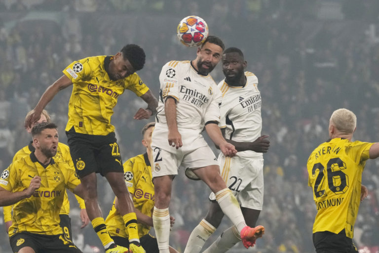 Ian Maatsen z Dortmundu, Dani Carvajal z Realu Madrid a Antonio Ruediger z Realu Madrid (zľava) počas finálového zápasu futbalovej Ligy majstrov Borussia Dortmund - Real Madrid. Foto: SITA/AP