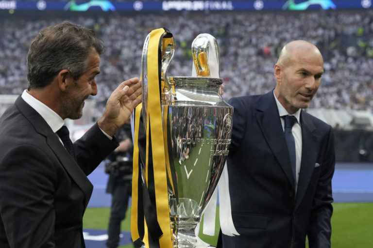 Bývalý hráč Dortmundu Karl-Heinz Riedle (vľavo) a bývalý hráč Realu Madrid Zinedine Zidane nesú trofej na ihrisku pred finálovým zápasom futbalovej Ligy majstrov. Foto: SITA/AP