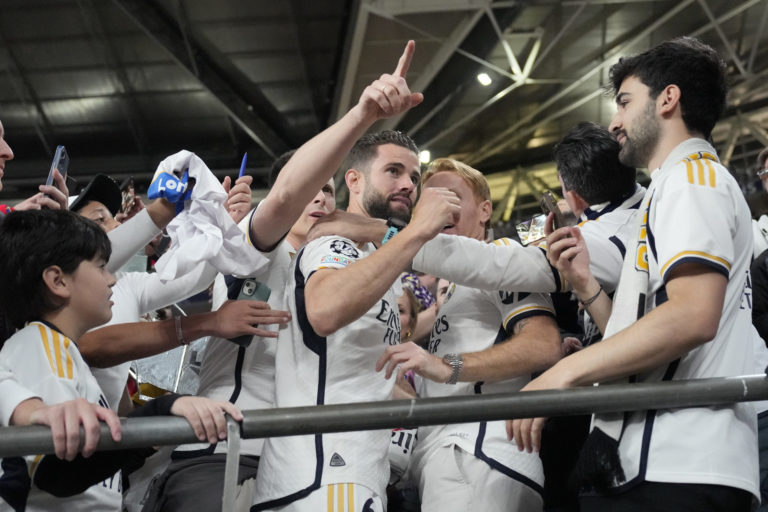 Hráč Realu Madrid Nacho oslavuje s fanúšikmi po víťazstve vo finálovom zápase futbalovej Ligy majstrov Borussia Dortmund - Real Madrid. Foto: SITA/AP