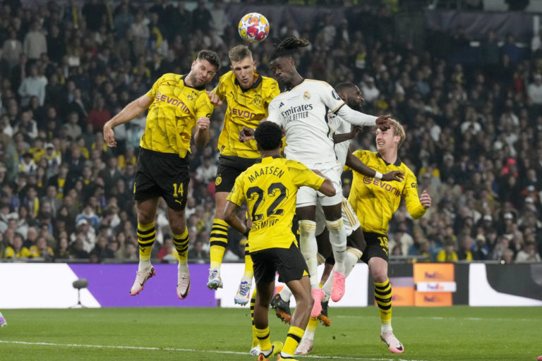 Hráč Dortmundu Niclas Fuellkrug, hráč Dortmundu Nico Schlotterbeck a hráč Realu Madrid Eduardo Camavinga (zľava) počas finálového zápasu futbalovej Ligy majstrov Borussia Dortmund - Real Madrid. Foto: SITA/AP