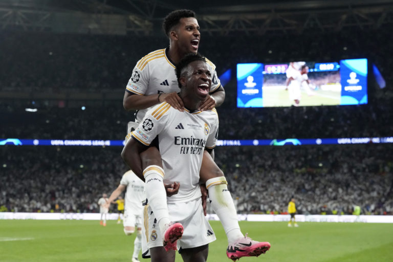 Hráč Realu Madrid Vinícius Júnior oslavuje po strelení druhého gólu vo finálovom zápase futbalovej Ligy majstrov medzi Borussiou Dortmund a Realom Madrid. Foto: archívne, SITA/AP