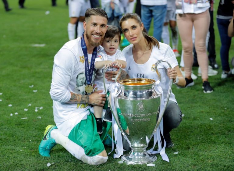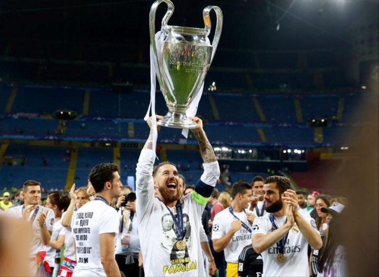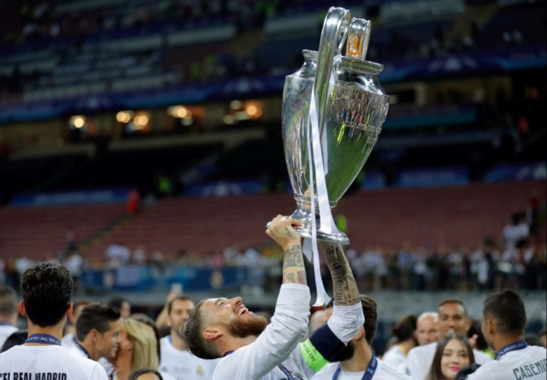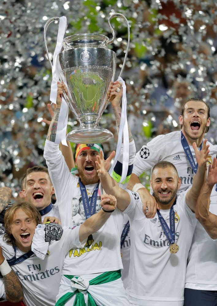Sergio Ramos s víťaznou trofejou po finálovom zápase Ligy majstrov, v ktorom Real Madrid zdolal Atlético Madrid. Miláno, 28. máj 2016. Foto: SITA/AP