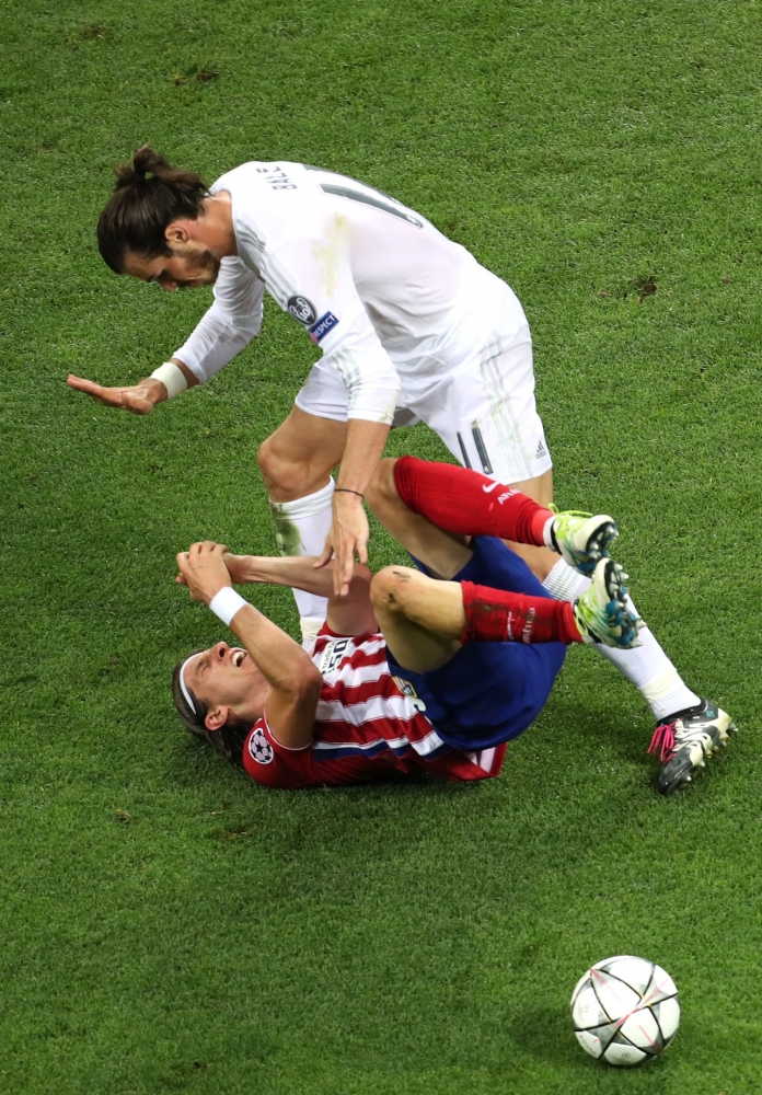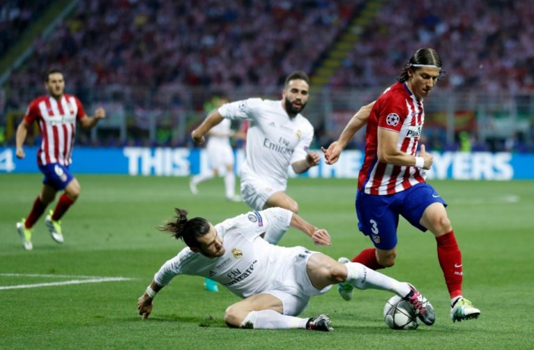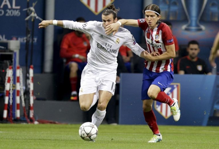 Gareth Bale z Realu Madrid v súboji s Felipom Luisom z Atlética Madrid počas finálového zápasu Ligy majstrov na štadióne San Siro v Miláne. Miláno, 28. máj 2016. Foto: SITA/AP