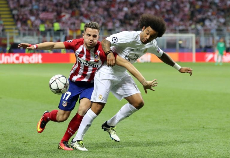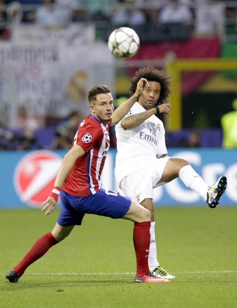 Marcelo z Realu Madrid v súboji so Saulom Niguezom z Atlética Madrid počas finálového zápasu Ligy majstrov na štadióne San Siro v Miláne. Miláno, 28. máj 2016. Foto: SITA/AP