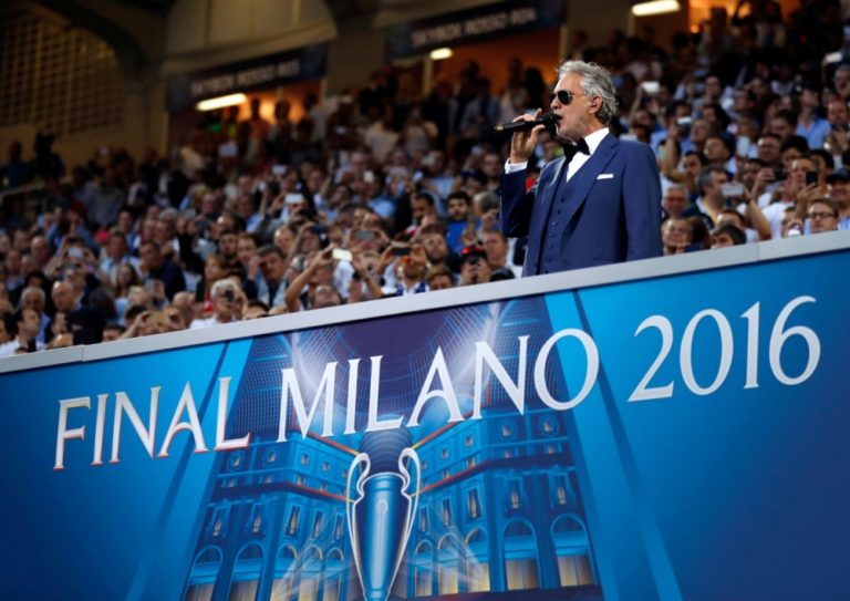 Vystúpenie Andreu Andrea Bocelliho pred finálovým zápasom Ligy majstrov medzi Realom a Atléticom na milánskom štadióne San Siro. Miláno, 28. máj 2016. Foto: SITA/AP