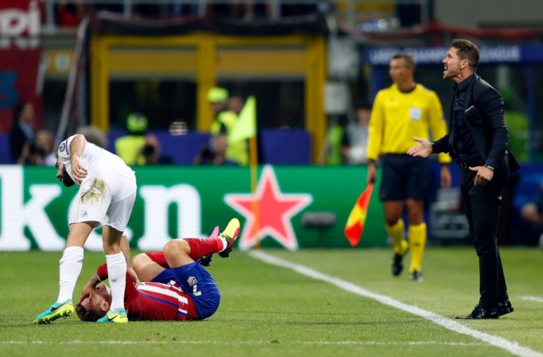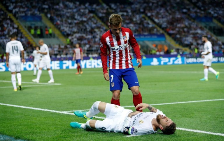 Otrasený Sergio Ramos z Realu Madrid po zákroku Antoina Griezmanna z Atlética Madrid počas finálového zápasu Ligy majstrov na štadióne San Siro v Miláne. Miláno, 28. máj 2016. Foto: SITA/AP