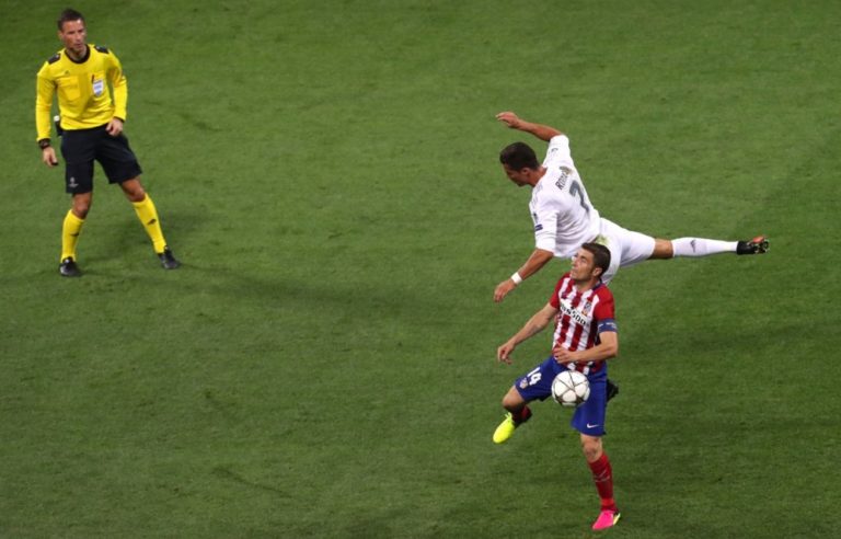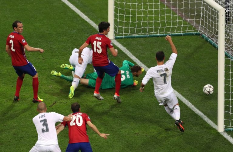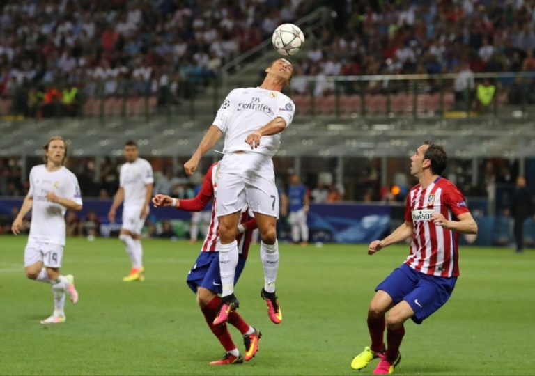 Cristiano Ronaldo z Realu Madrid v hlavičkovom súboji s hráčmi Atlética Madrid počas finálového zápasu Ligy majstrov na štadióne San Siro v Miláne. Miláno, 28. máj 2016. Foto: SITA/AP