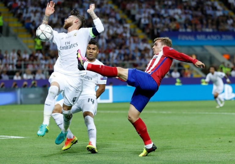 Sergio Ramos z Realu Madrid v súboji Antoineom Griezmannom z Atlética Madrid počas finálového zápasu Ligy majstrov na štadióne San Siro v Miláne. Miláno, 28. máj 2016. Foto: SITA/AP