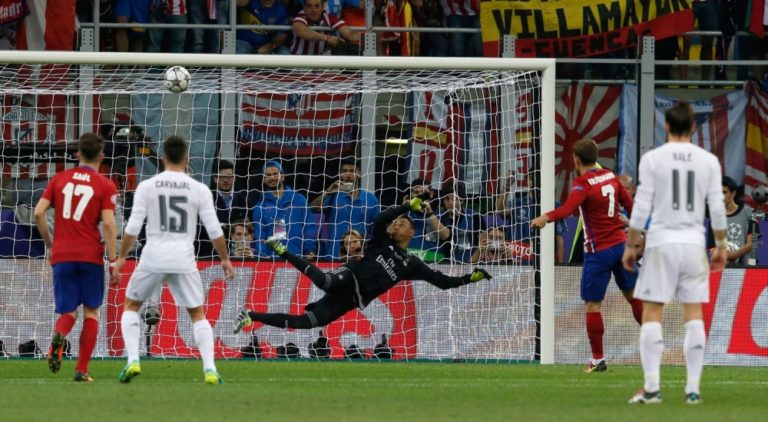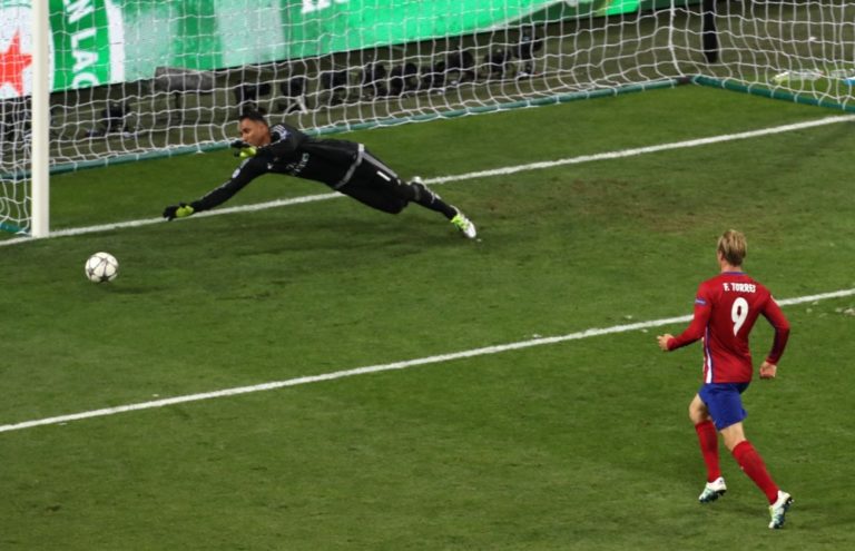 Zákrok brankára Realu Madrid Keylora Navasa po strele útočníka Altética Madrid Fernanda Torresa počas finálového zápasu Ligy majstrov na štadióne San Siro v Miláne. Miláno, 28. máj 2016. Foto: SITA/AP
