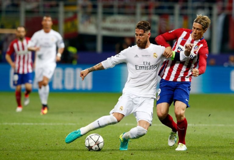 Sergio Ramos z Realu Madrid v súboji s Fernandom Torresom z Atlética Madrid počas finálového zápasu Ligy majstrov na štadióne San Siro v Miláne. Miláno, 28. máj 2016. Foto: SITA/AP