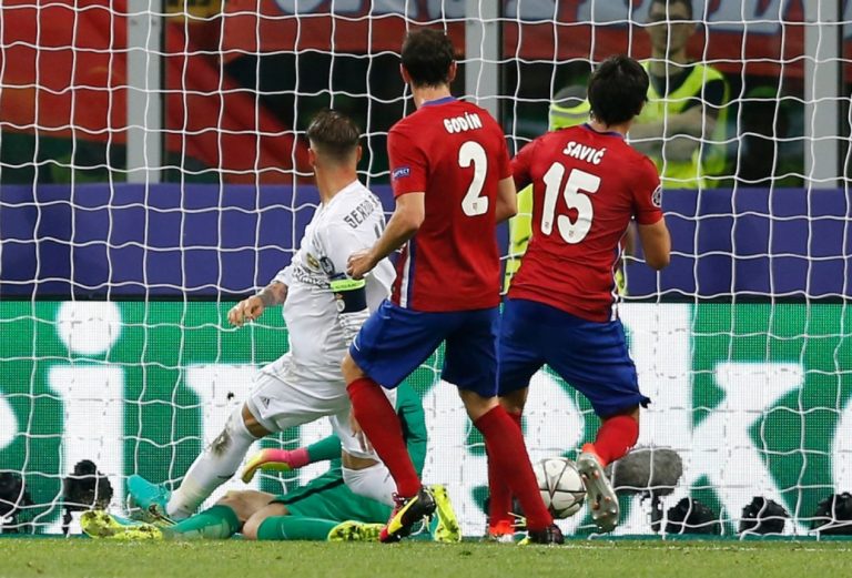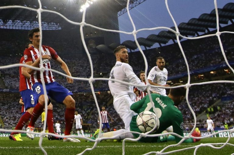 Sergio Ramos z Realu Madrid prekonáva brankára Atlética Madrid Jana Oblaka počas finálového zápasu Ligy majstrov na štadióne San Siro v Miláne. Miláno, 28. máj 2016. Foto: SITA/AP