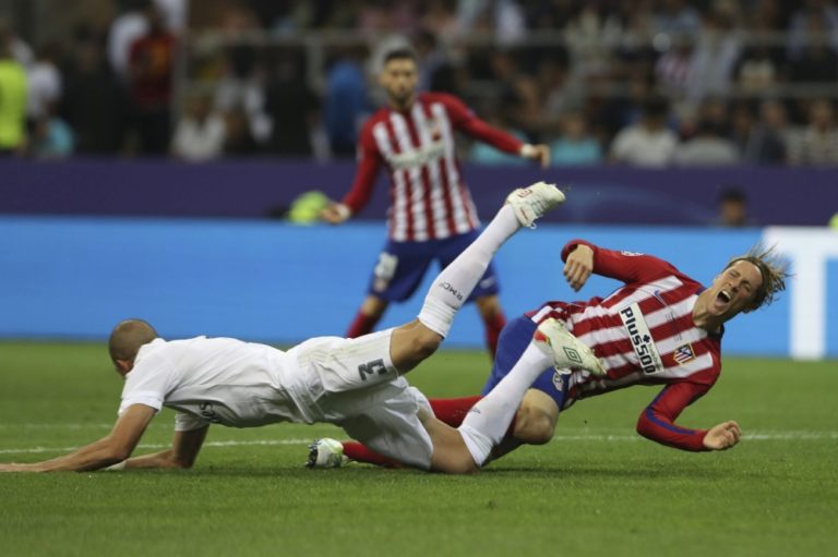 Pepe z Realu Madrid v pokutovom území fauluje Fernanda Torresaz Atlética Madrid počas finálového zápasu Ligy majstrov na štadióne San Siro v Miláne. Miláno, 28. máj 2016. Foto: SITA/AP