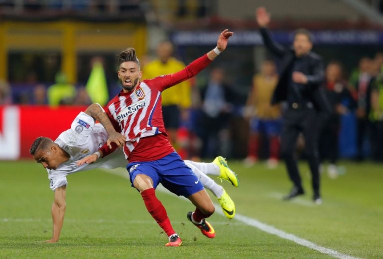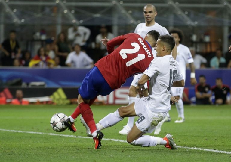 Danilo z Realu Madrid v súboji s Yannickom Carrascom z Atlética Madrid počas finálového zápasu Ligy majstrov na štadióne San Siro v Miláne. Miláno, 28. máj 2016. Foto: SITA/AP