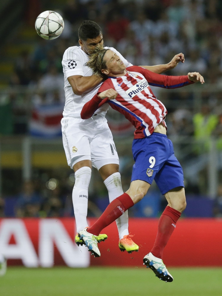 Útočník Atlética Madrid Fernando Torres v hlavičkovom súboji s Casemirom z Realu Madrid počas finálového zápasu Ligy majstrov na štadióne San Siro v Miláne. Miláno, 28. máj 2016. Foto: SITA/AP