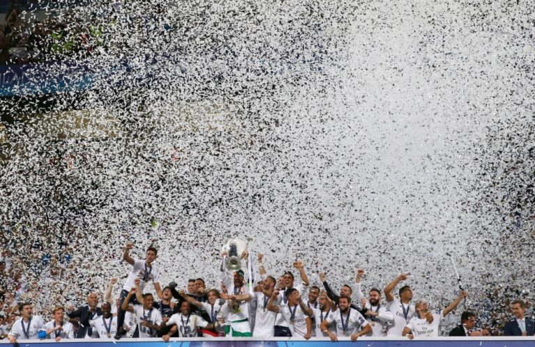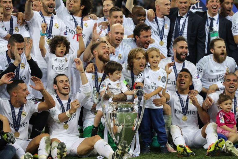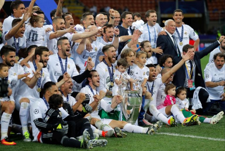 Radosť hráčov Realu Madrid s víťaznlu trofejou po finálovom zápase Ligy majstrov, v ktorom zdolali Atlético Madrid. Miláno, 28. máj 2016. Foto: SITA/AP