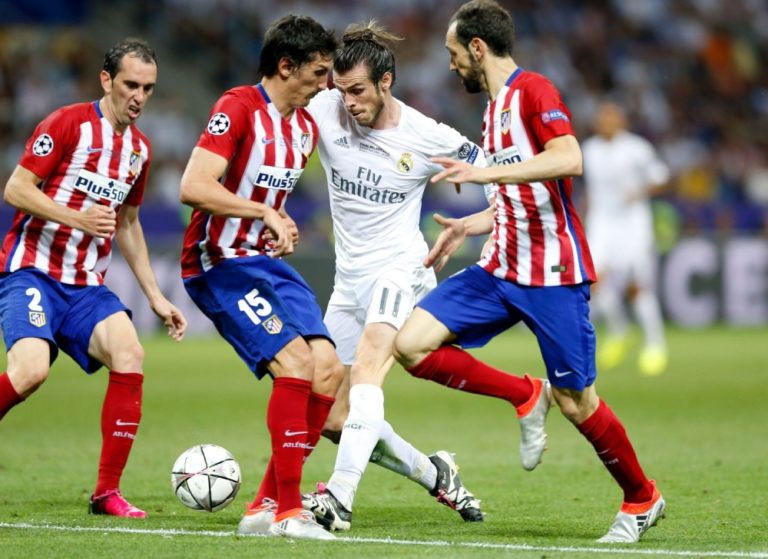 Gareth Bale z Realu Madrid v súboji so Saulom Niguezom z Atlética Madrid počas finálového zápasu Ligy majstrov na štadióne San Siro v Miláne. Miláno, 28. máj 2016. Foto: SITA/AP