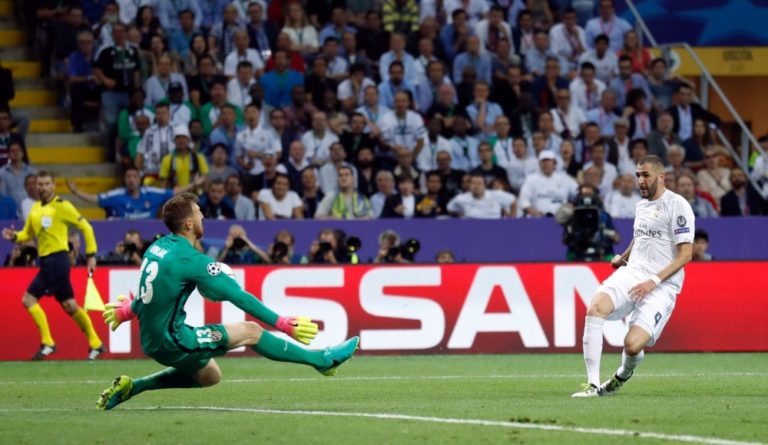 Zákrok brankára Atlética Madrid Jana Oblaka pri šanci Karimu Benzemu z Realu Madrid počas finálového zápasu Ligy majstrov na štadióne San Siro v Miláne. Miláno, 28. máj 2016. Foto: SITA/AP