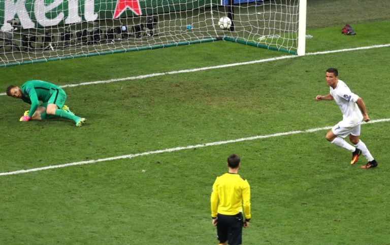 Cristiano Ronaldo premieňa pokutový kop v penaltovom rozstrele vo finále Ligy majstrov, v ktorom Real Madrid porazil Atlético. Miláno, 28. máj 2016. Foto: SITA/AP