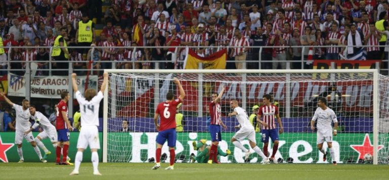Hráči Realu Madrid sa tešia z gólu Sergia Ramosa v sieti Atlética Madrid počas finálového zápasu Ligy majstrov na štadióne San Siro v Miláne. Miláno, 28. máj 2016. Foto: SITA/AP