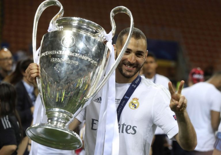 Karim Benzema s víťaznou trofejou po finálovom zápase Ligy majstrov, v ktorom Real Madrid zdolal Atlético Madrid. Miláno, 28. máj 2016. Foto: SITA/AP
