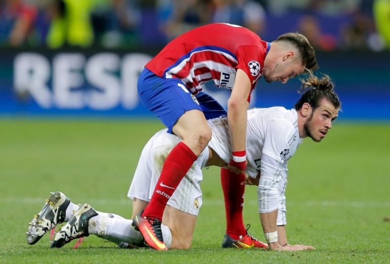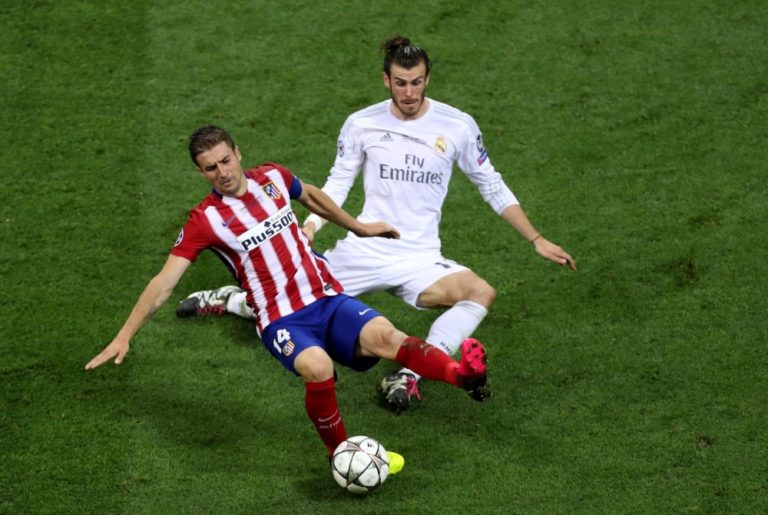 Gareth Bale z Realu Madrid v súboji s Gabim Fernandezom z Atlética Madrid počas finálového zápasu Ligy majstrov na štadióne San Siro v Miláne. Miláno, 28. máj 2016. Foto: SITA/AP