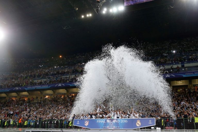 Slávnostný úvod finálového zápasu Ligy majstrov medzi Realom a Atléticom na milánskom štadióne San Siro. Miláno, 28. máj 2016. Foto: SITA/AP