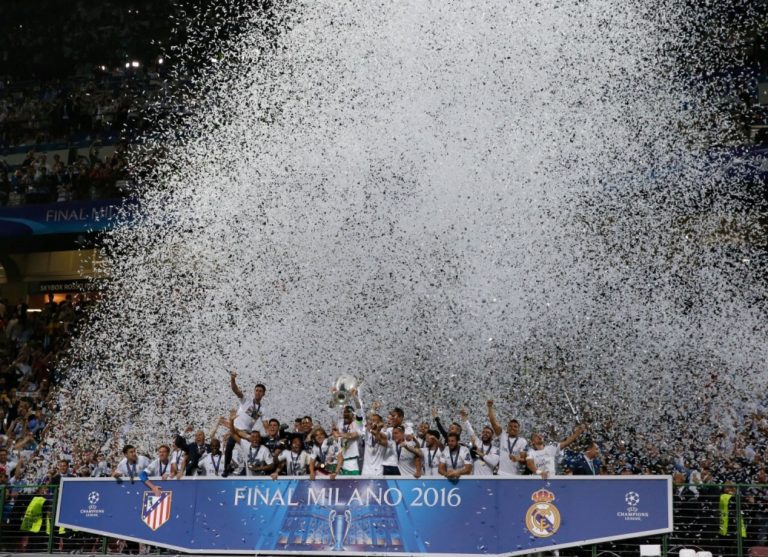 Radosť hráčov Realu Madrid s víťaznou trofejou po finálovom zápase Ligy majstrov, v ktorom zdolali Atlético Madrid. Miláno, 28. máj 2016. Foto: SITA/AP
