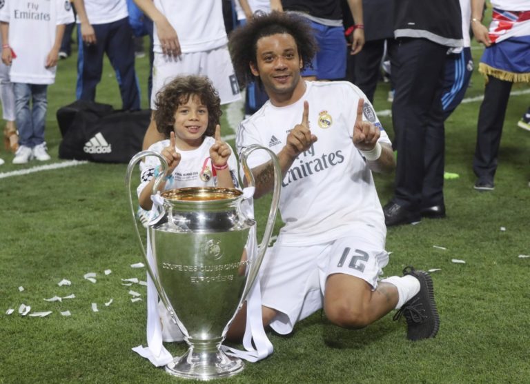 Marcelo s víťaznou trofejou po finálovom zápase Ligy majstrov, v ktorom Real Madrid zdolal Atlético Madrid. Miláno, 28. máj 2016. Foto: SITA/AP