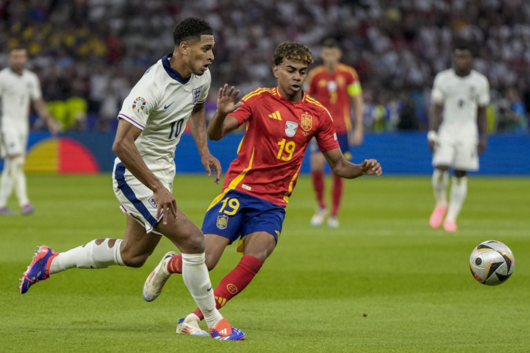 Anglický reprezentant Jude Bellingham španielsky mladík Lamine Yamal počas finálového zápasu na ME vo futbale 2024. Berlín, 14. júl 2024. Foto: SITA/AP.