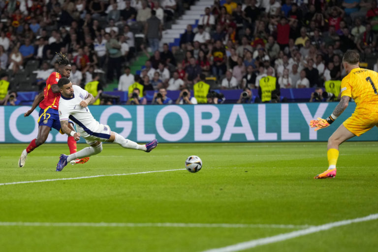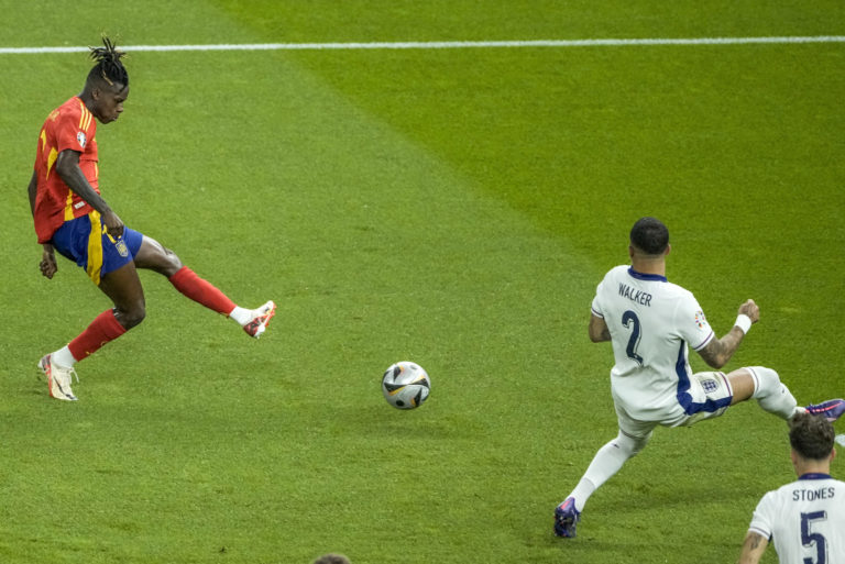 Španiel Nico Williams strieľa v 47. minúte úvodný gól finálového zápasu ME vo futbale 2024 proti Anglicku. Berlín, 14. júl 2024. Foto: SITA/AP.