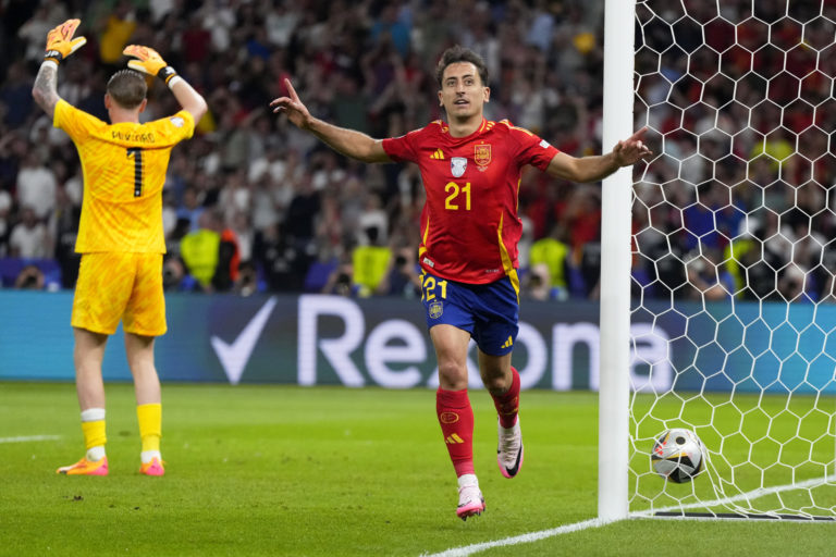 Španiel Mikel Oyarzabal sa teší z gólu v sieti Anglicka vo finále ME vo futbale 2024. Berlín, 14. júl 2024. Foto: SITA/AP.